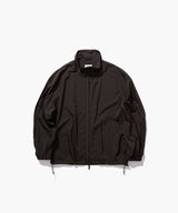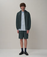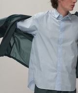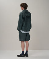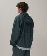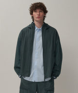 古着のモーターサイクルジャケットをベースにしたスポーツジャケット。フードを取り外し可能なデザインにアップデートしました。極端にオーバーサイズなシルエットが特徴です。前身頃は生地を2重仕立てにしており、薄手の生地ながら透けは気にならなくなっています。