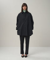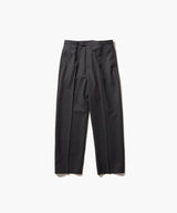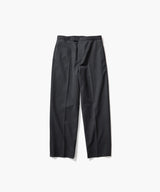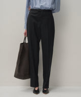 ノータックのややテーパードシルエットパンツ。体のラインを拾いづらい腰回りの寸法感です。マーベルト仕様を採用しています。また、細くふっくらとした芯を入れノーステッチで仕上げたディティールが特徴です。
