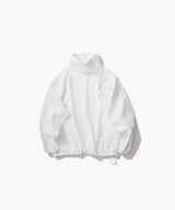 天幅広めのスタンドカラーのシャツプルオーバー。後ろ中心にコンシールファスナーを付けており、着脱しやすく、また襟が立つように保形の役割もしています。袖口にはストレッチ性あるバインダー、裾にはゴムとアジャスターを施しているので、合わせるボトムによって着丈のバランスを整えていただけます。