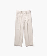 股上はすっきりとさせ、サイドに分量を持たせたタックワイドパンツ。ウエストの両サイドにはドットボタン付きのタブがついており、2段階のサイズ調節が可能です。スラックスのような上品な表情とミリタリーの無骨さを併せ持った、通年着用可能なアイテムです。