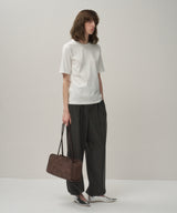 This shoulder bag is the perfect size for a day out on the town. Its simple silhouette is characterized by a beautiful curved design when viewed from the side. The bag deliberately avoids the use of zippers, instead featuring a seamless design where the body and cover flow smoothly into one another. The handles and edges are finished with the same leather as the body, polished to a glossy sheen that resembles the exterior leather, resulting in a soft, comfortable feel that harmonizes with the body's texture.