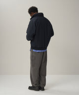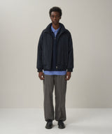 ナイロンとポリエステルの熱収縮率の違いを生かした、膨らみのある混繊糸を使用した生地に、奈良墨を使用した顔料プリントを施した素材です。通常の3倍の時間をかけてゆっくりと洗いこむことで、従来の顔料とは異なる水墨画のような深みのある色合いが特徴です。ライナーはしっかりと保温性が伴うので、真冬でも着用することができます。