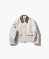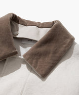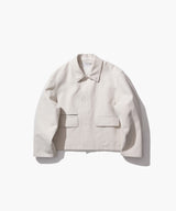 ショート丈のオーバーサイズのジャケット。HEMP SUEDの生地に全面芯を貼り、ハリをもたらせた素材で作成しました。ハンティングジャケットをベースに、ディテールをアレンジしています。低めのついている大きめのフラップポケットが特徴で、取り外し可能なベルベットの襟が付いています。