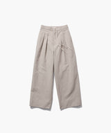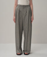 分量感のある内タックのワイドパンツ。裾に向かってうっすらテーパードのかかったラインで、シューズを選ばず着用できます。細めのウエストベルト巾で内側紐で調整可能、後ろのみゴムの仕様です。