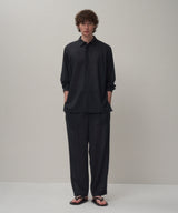 裾に向かいテーパードがかかった、スッキリとしたシルエットが特徴のイージーパンツ。同素材のシャツとセットアップで着用いただけます。ベルトループ付きですが、ベルト内側に紐が通っており、ベルト無しで調整して着用可能です。風通しも非常に良く、またナチュラルストレッチ性も兼ね備えており、梅雨時期~真夏に向けて、最適のウール商材です。