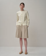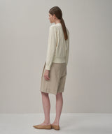 襟ぐりのしっかり詰まったレギュラーフィットのクルーネックカーディガン。同素材の半袖クルーネックと合わせてアンサンブルのようにも着用できます。また、襟元のボタンをいくつか開けてヘンリーネックプルオーバーのような着方もおすすめです。