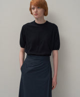 肘にかかるくらいの長めの袖丈のクルーネックニット。袖口にかけてテーパードしながらも甘すぎないパフ分量でTシャツのように着用できます。身頃全体でギャザーのドレープを出しているので、脇の溜まりが少なく、着用した際に美しく見せてくれる1着です。