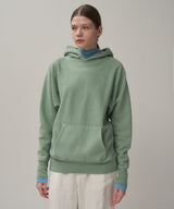 太番手の糸を通常の倍の密度で 限界まで高密度に、和歌山にて編み上げたジャージにNATURAL DYE (天然染め) を施した特別なアイテムです。高密度に編み上げることで生地自体の耐久性は勿論のこと、製品染めをしてしっかりと洗いを掛けている為、乾燥機に掛けても縮みが起きないという秀逸なアイテム。裏毛は表面、裏面、その間を繋ぐ面の3層構造。そうすることによって、間にたっぷりと空気を含む為、生地の伸びが圧倒的に良くなり、より暖かくなる、ATONオリジナル裏毛素材です。