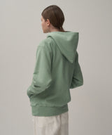 シャープな三角形のフードと、少し大きめのシルエットが特徴的なATON定番のフーディースウェット。袖口は力点を一点に集中させない様、リブをトライアングルに設計しており、機能を兼ね備えたデザインになっています。胸元に付いた、”A”マークは植毛フロッキーの為、剥がれること無くベルベットの様な手触りです。