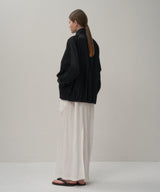 裏地もなく、軽く仕立てたブルゾン。通常、レザーのハリントンブルゾンでありそうな雰囲気を、ナイロン素材で作りました。メンズサイズをベースに、袖口・裾口はリブを使用せずゴムを折込んでギャザーを寄せています。マニッシュな印象はキープしながら、女性らしさをプラスしています。