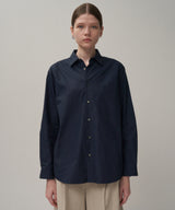 レディースのスタンダートなシャツ。身幅や着丈を調整し、リラックス感ある着心地に仕上げながら、ドレスシャツのような上品な雰囲気が特徴です。脇は細めの折り伏せ縫いで仕上げてシャープな印象です。女性ならではの沿った襟ぐりと前下がり設計で、ジャケットのインナーとしてもおススメで、アームホールはゆとりのあるサイズ感でありながら、サイドから見たときにすっきりとした印象になるようパターン設計されています。00サイズ、01サイズはそれぞれの身長に合わせてインナーにも使えるジャストな設計、02サイズはオーバーサイズなイレギュラーグレーディングになっています。