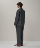 先染めのウール糸を岐阜羽島市にて、ゆっくり丁寧に織られた素材です。通常のウールトロピカル素材とは異なり、高密度に特殊な織り方をしている為、さらっとした肌触りとしっかりした肉感が特長のATONオリジナル素材です。